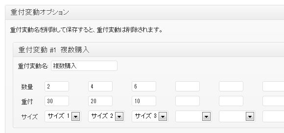 商品の購入数量に応じて、1個当たりの重付と商品サイズを変動させることができます。例えば以下の例では、2個以上買えば1個当たりの重付は 30 となるので、2個では、60、3個では、90 となり3個まではサイズ1の配送料が適用されるようになります。4個購入すると次の条件に合致するので、1個当たりの重付は 20 となり、4個で 80、5個で100となり、5個まではサイズ2の送料が適用されます。6個以上の場合は1個当たりの重付が 10 となるので、10個まではサイズ3の送料が適用される、という具合です。